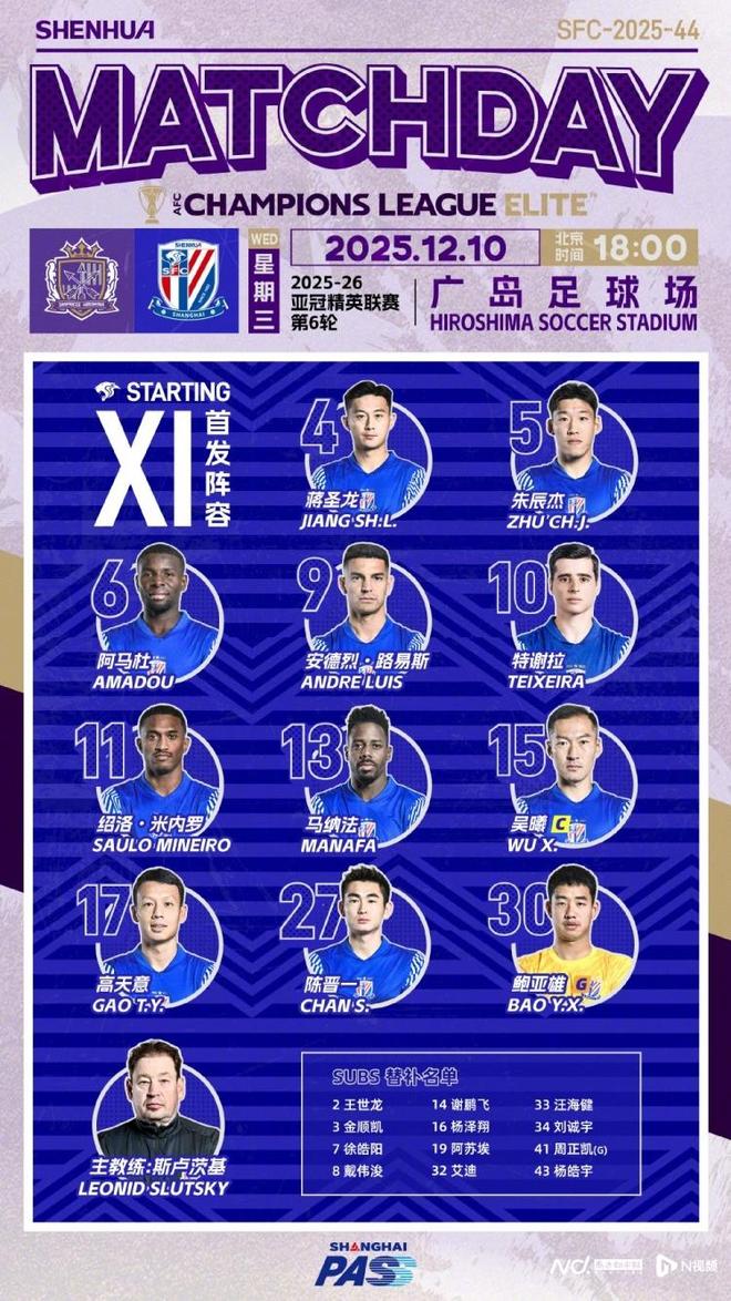 上海申花本场首发阵容。